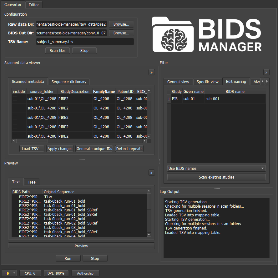 Load TSV...: lets you reload a dataset by browsing their “subject_summary.tsv”. This skips the scanning process, which can take a lot of time. You still need to set the Raw data Dir and the BIDS Out Dir.Generate unique IDs: BIDS-Manager will be able to identify the different subjects and assign unique identifiers.Detect repeats: therepcolumn will show a 2, which means that this entry is the latest version (common when a run is interrupted and restarted). Sometimes this will be done automatically when you scan the file.Save changes: it updates the TSV file “subject_summary.tsv” with any edits you’ve made.