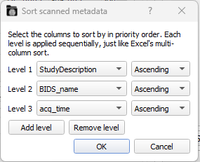 Sort: It allows you to order the metadata table by the selected columns and by ascending or descending order. This is specially useful when you have scanned folders with different studies, subjects or acquisition times.