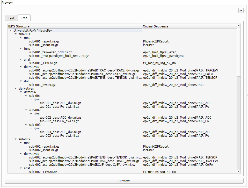 The right side shows the proposed BIDS conversion; the left side shows the original sequence name. You can click on Preview to update it with the most recent modifications done.