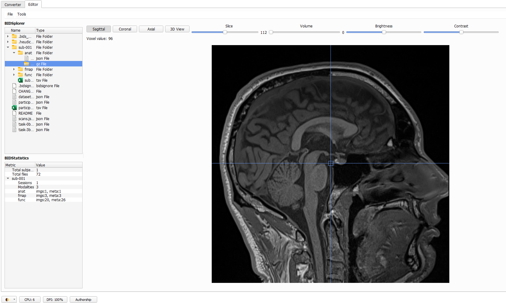 The second tab in BIDS-Manager is the Editor. It lets your preview and edit metada (.json and .tsv files) and imaging data (DICOMS, NIfTI volumes…).