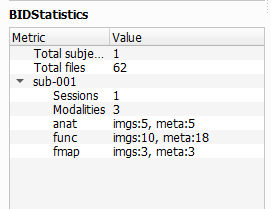 Once you’ve load your dataset, BIDStatistic will show you a summary of your dataset, such as total amount of subjects and files, as well as sessions and sequence types per subject.
