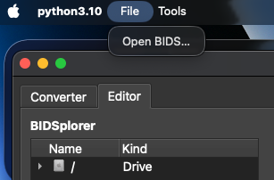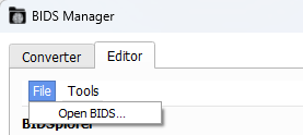 Go to the top menu and click File, in the dropdown select Open BIDS..., then a file browser will appear. Navigate to the root or absolute folder of your BIDS dataset (the top-level directory that contains all subfolders).