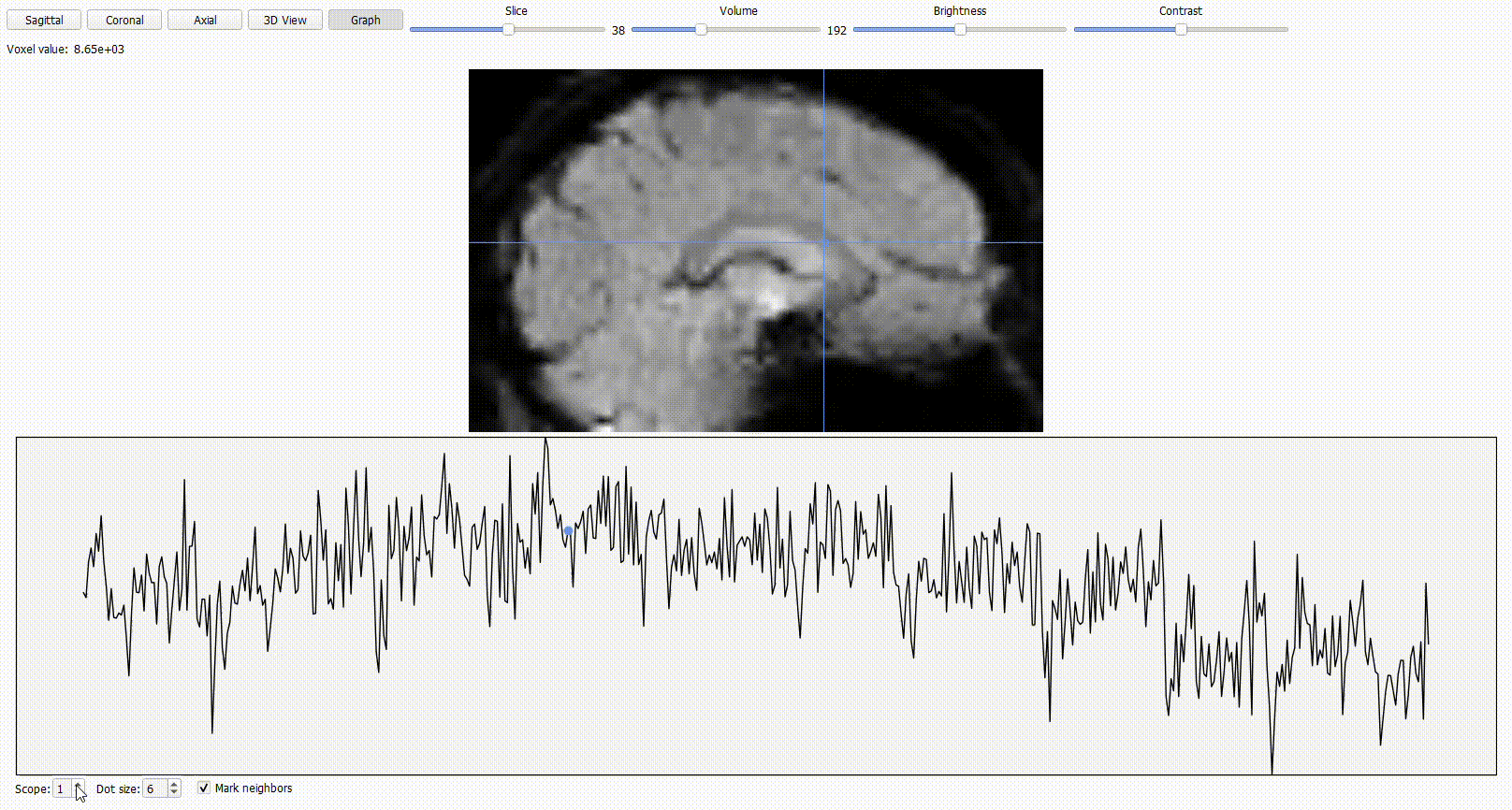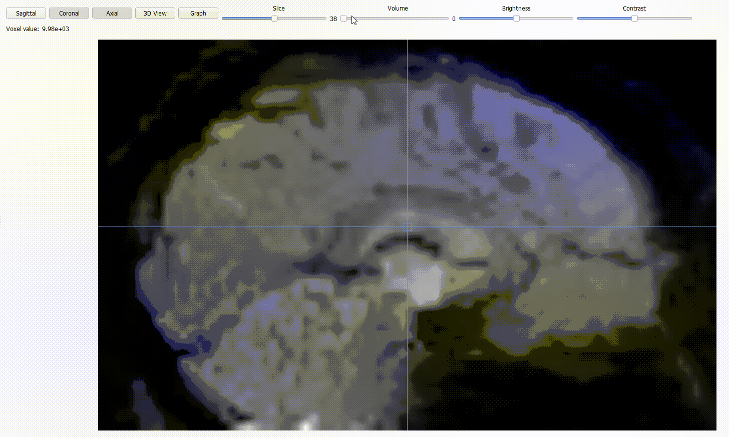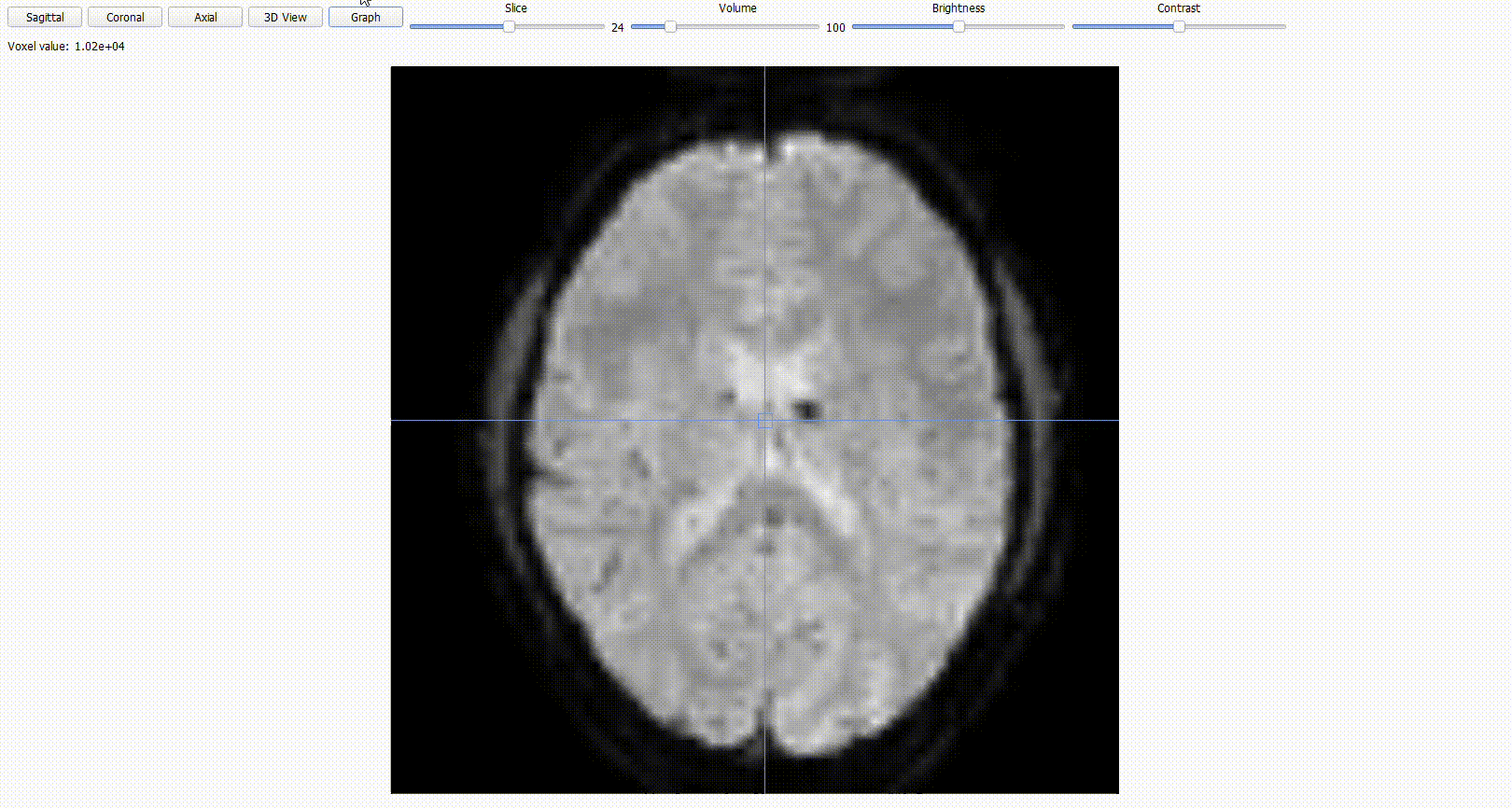 Graphoption for functional images that allows to see the how the signal changes over time. The graph along with thevolumetoggle will help you spot “jumps” or big irregularities that could be cause by the participant movements or scanner artifacts.