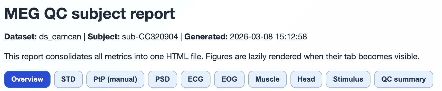 This header confirms dataset/subject identity and report generation time, and exposes the top-level navigation tabs.