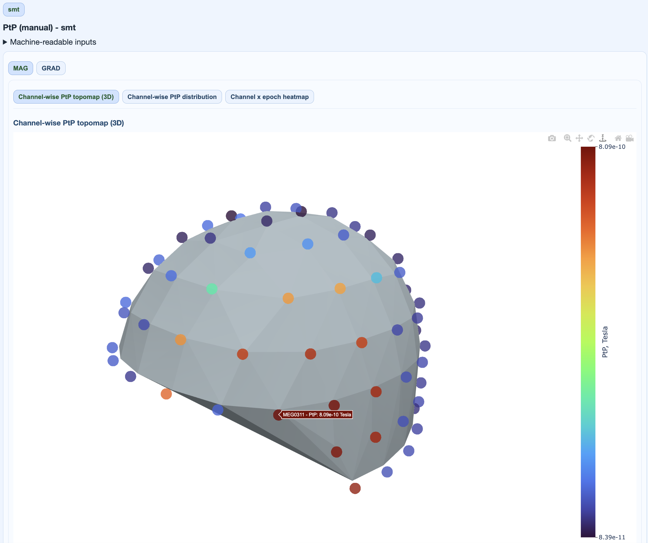 The same visualization patterns apply to both MAG and GRAD channel types. PtP (auto) uses MNE’s built-in detection algorithm, while PtP (manual) uses MEGqc’s custom thresholding approach.